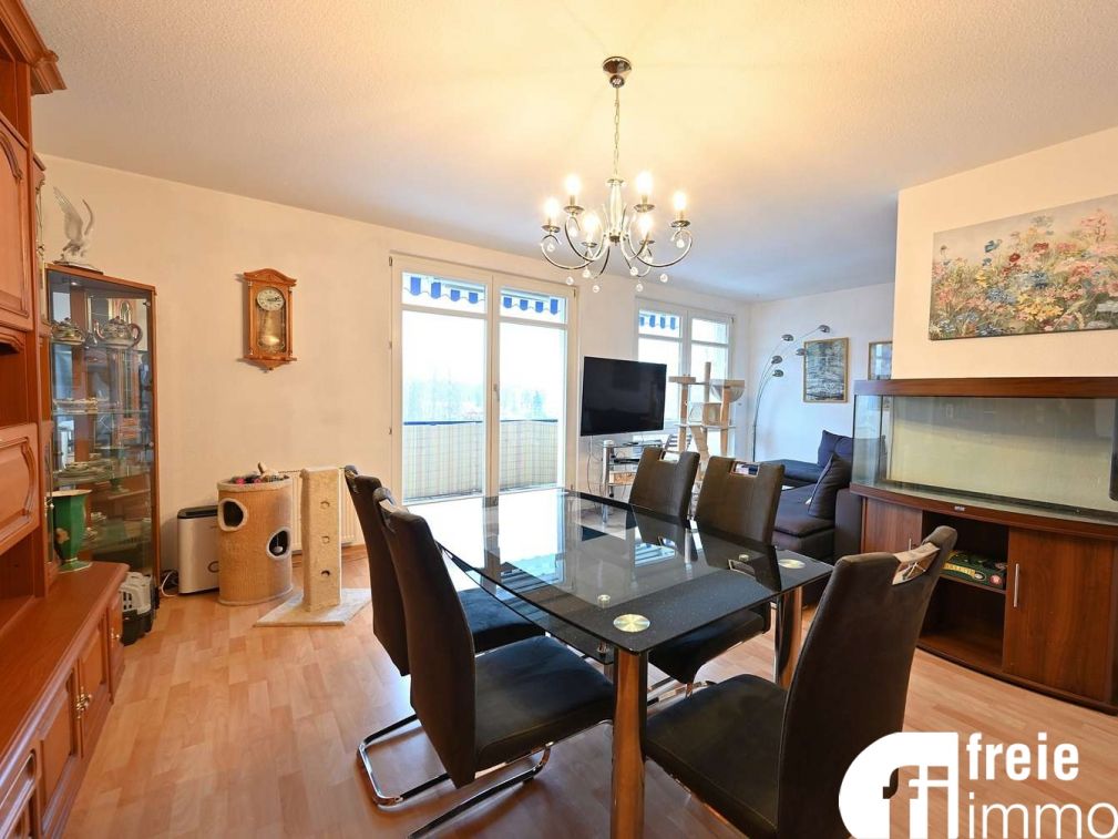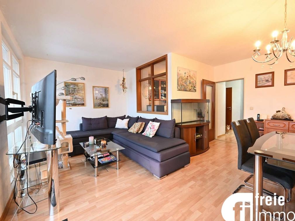 Die Wohnung im 3. Obergeschoss ist nach Osten ausgerichtet und verfügt über eine kleine innenliegende geflieste Küche, die vom Wohnzimmer abgetrennt ist. Ein großes helles Wohnzimmer mit bodentiefen Fenstern und Zugang zum Balkon bietet freien Blick ins Umfeld. Des Weiteren gibt es ein innenliegendes gefliestes Bad mit Wanne, ein Gäste-WC (innenliegend), ein Schlafzimmer, ein Kinder/Arbeitszimmer mit Laminatboden, sowie einen kleinen zentralen Flur. Als Bodenbeläge wurden verlegt: in den Wohnräumen - Laminat in Bädern und Küche - Fliesen Mit etwas handwerklichem Geschick können individuelle Ausstattungswünsche umgesetzt werden, um ein gemütliches neues Zuhause zu gestalten. Zur Wohnung gehören ein Duplex-Tiefgaragenstellplatz (6.000,00 €) und ein Kellerabteil. Der Fahrrad- und Trockenraum wird gemeinschaftlich genutzt. Energieausweis: nach Verbrauch, 112kWh/(m²•a), Energieeffizienzklasse D, Baujahr 1995, Energieträger Fernwärme, gültig bis: 15.08.2028Lage