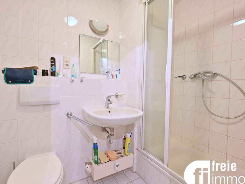 Die Wohnung im Hochparterre ist für einen Singlehaushalt ideal geeignet. Eine kleine Küche mit älterer EBK, Fenster und Zugang vom Wohnbereich, ein großer, lichtdurchfluteter Wohn-Schlafbereich mit Zugang zum großen Balkon, von dem Sie einen angenehmen Blick ins grüne Umfeld haben und ein innenliegendes Bad, gefliest mit Dusche und WM-Anschluss, machen die Wohnung komplett. Im Wohnbereich ist Laminat verlegt, die Fenster sind mit Rollläden ausgestattet. Hier finden Sie Ihr kleines feines Zuhause. Zur Wohnung gehören ein Tiefgaragenstellplatz (6.000,00 €) und ein Kellerabteil. Gemeinschaftlich genutzt wird der Fahrrad- und Trockenraum.Lage