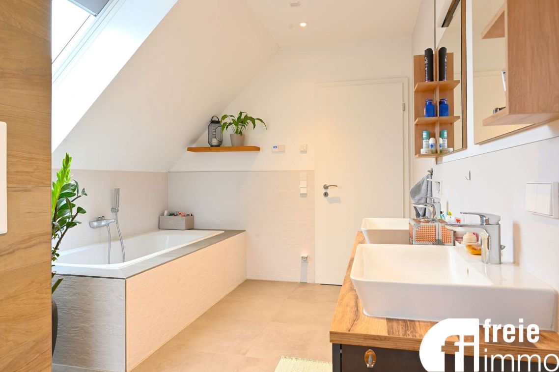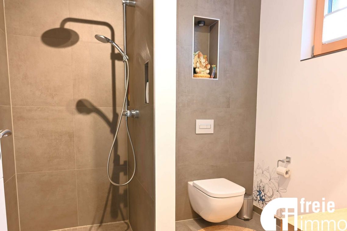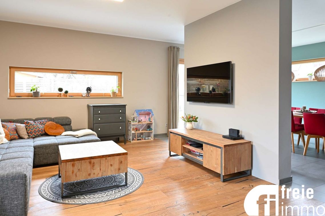 Die Ausstattung dieser Immobilie besticht durch eine gelungene Kombination aus hochwertigen Materialien, moderner Technik und einem Wohnkomfort, der auch gehobenen Ansprüchen gerecht wird. In den Wohnbereichen schafft edles Parkett eine warme und einladende Atmosphäre, während hochwertige Fliesen in Küche, Flur und Bädern das stilvolle Gesamtbild abrunden. Der offen gestaltete Wohn- und Essbereich bildet mit der modernen Einbauküche und integrierter Speisekammer, das Herzstück des Hauses und wird zum zentralen Treffpunkt für Familie und Gäste. Große Holz-/Aluminiumfenster mit Dreifachverglasung sorgen für hervorragende Wärme- und Schalldämmung, während elektrisch betriebene Raffstores eine komfortable Lichtregulierung und optimale Privatsphäre ermöglichen. Eine durchgängige Fußbodenheizung schafft in allen Räumen ein behagliches Wohnklima. Vom Wohnbereich aus gelangen Sie auf die ca. 30 m² große Terrasse, die zu entspannten Stunden im Freien oder geselligen Abenden einlädt. Über eine bequeme, beleuchtete Treppe erreichen Sie das Obergeschoss, das als ruhiger Rückzugsbereich für die Familie konzipiert ist. Neben dem Elternschlafzimmer überzeugt insbesondere die separate Ankleide mit großzügigem Stauraum. Zwei weitere Zimmer eignen sich ideal als Kinder- oder Arbeitszimmer. Das großzügige Badezimmer mit Badewanne und zwei Waschbecken bietet Raum für Entspannung. Die hochwertige Bauweise unterstreicht den Qualitätsanspruch des Hauses: Eine massive Betondecke zwischen Erd- und Obergeschoss sowie eine Holzdecke bis zur Dachspitze verbinden Stabilität mit wohnlicher Architektur. Für eine nachhaltige und effiziente Energieversorgung sorgt eine moderne Erdwärme-Wärmepumpe mit Tiefenbohrung, die niedrige Betriebskosten und zukunftsorientiertes Heizen ermöglicht. Die Süd-Ost Ausrichtung des Hauses ermöglicht die nachträgliche Installation einer PV-Anlage mit optimalem Ertrag für die Eigennutzung. Insgesamt erwartet Sie eine durchdacht ausgestattete Immobilie mit hohem Wohnkomfort und einem stimmigen Gesamtkonzept, das keine Wünsche offenlässt. Energieausweis: Bedarfsausweis, 22 kWh/(m²·a), Energieeffizienzklasse A+, wesentlicher Energieträger Strom, Baujahr Anlagentechnik 2018, gültig bis 20.11.2028.Lage